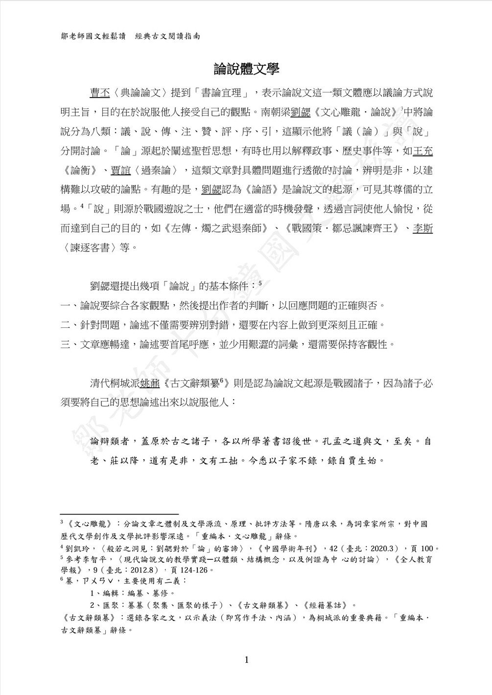 論說文是中國古代文學的重要文體,用以說明主旨、說服他人。曹丕在〈典論論文〉中提到「書論宜理」,強調論說文應通過議論方式闡述觀點。