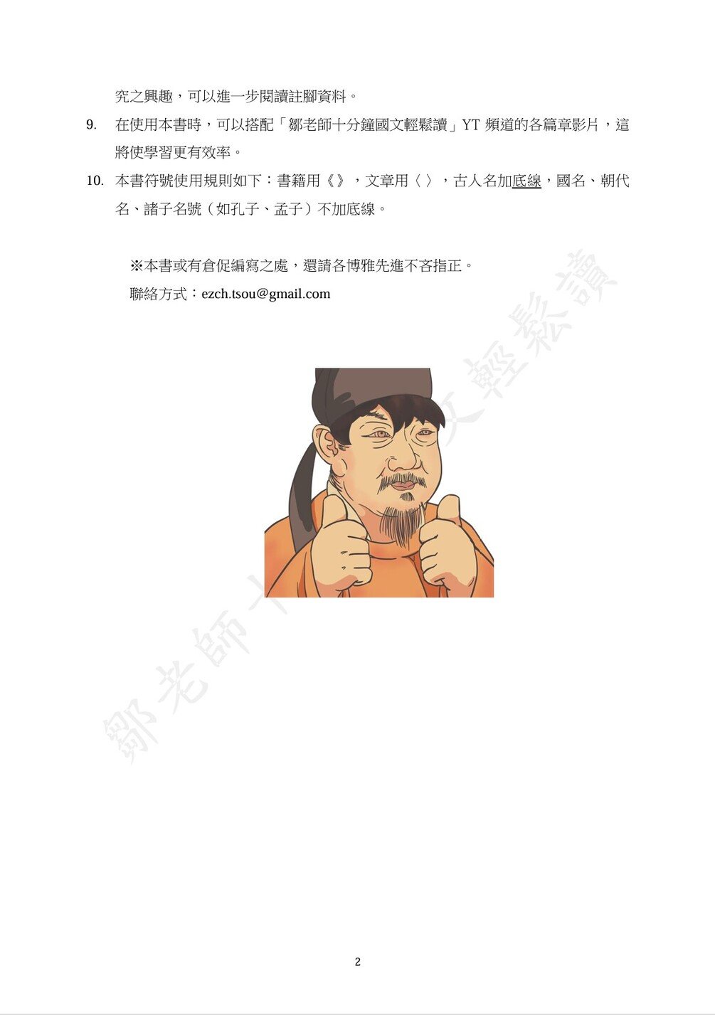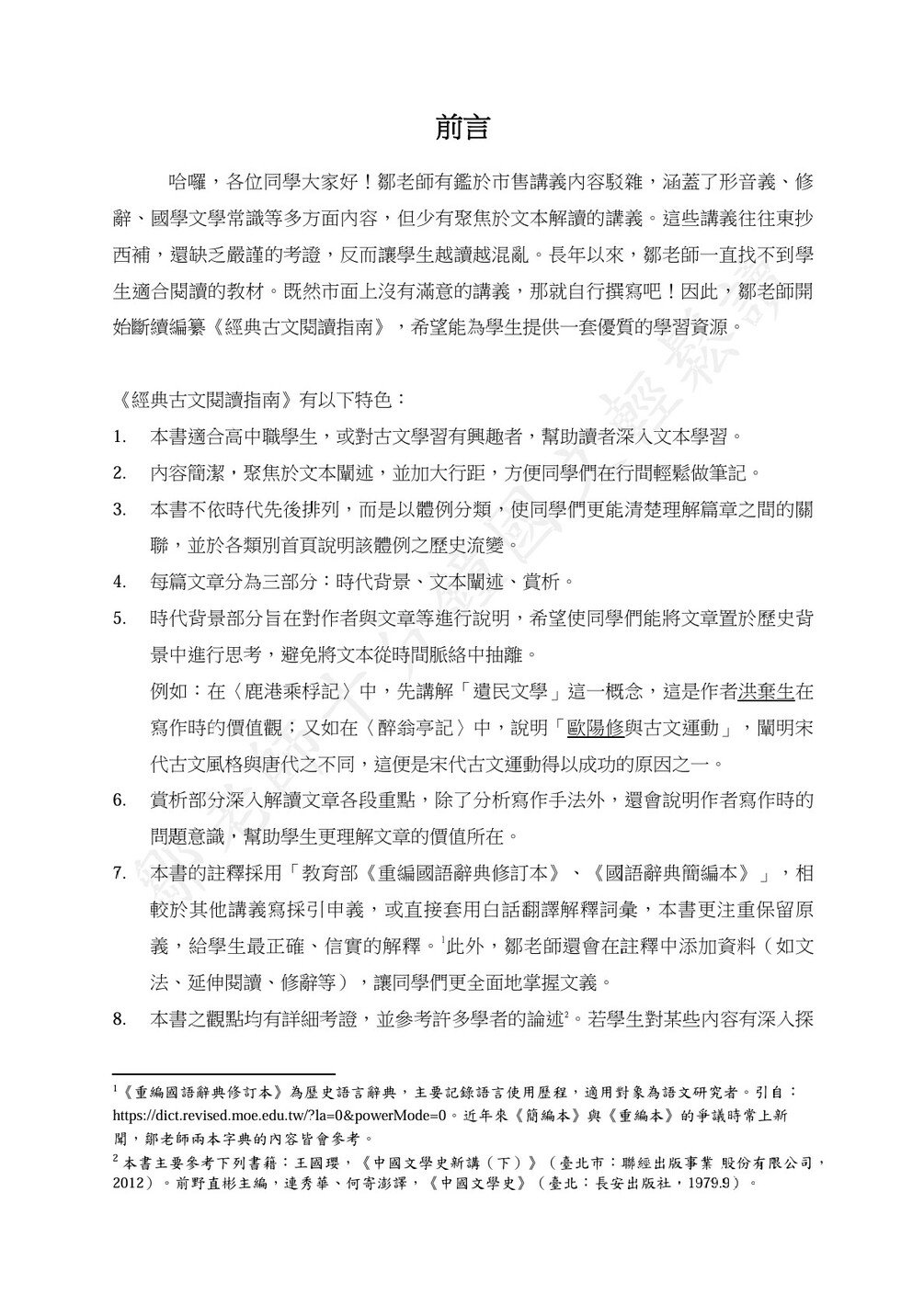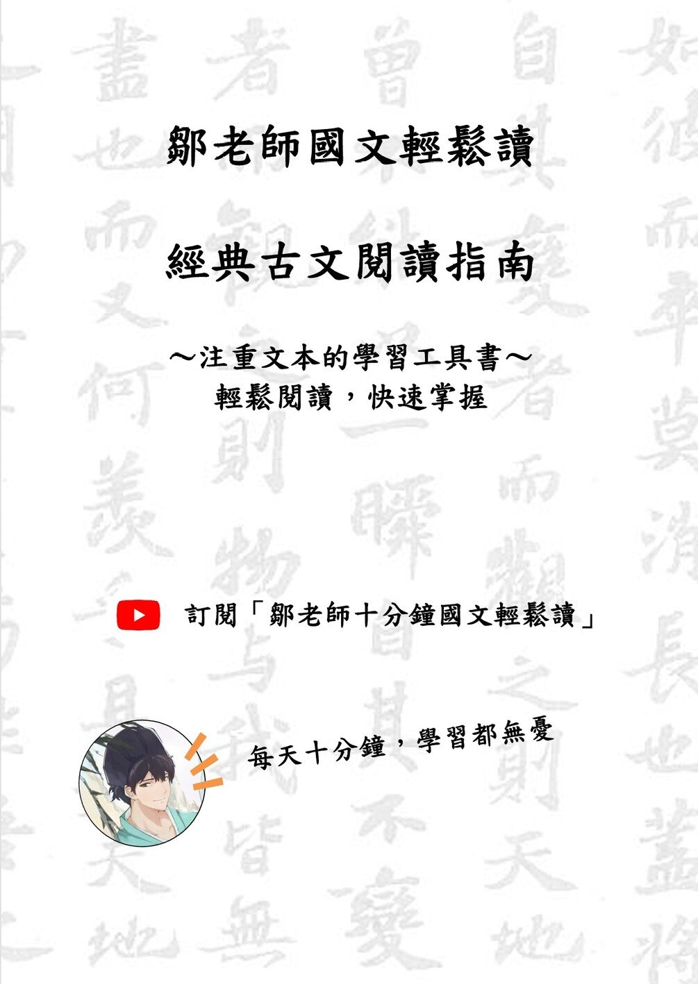 鄒老師深知學生的需求,特別編纂了《經典古文閱讀指南》,提供一套聚焦於文本解讀的優質教材。這本書不僅內容簡潔、行距寬鬆,方便筆記,更以體例分類,幫助您輕鬆理解篇章關聯。每篇文章分為時代背景、文本闡述、賞析三部分,帶同學們深入掌握古文精髓。還搭配精確的註釋與鄒老師的影音教學,讓學習更有效率喔!